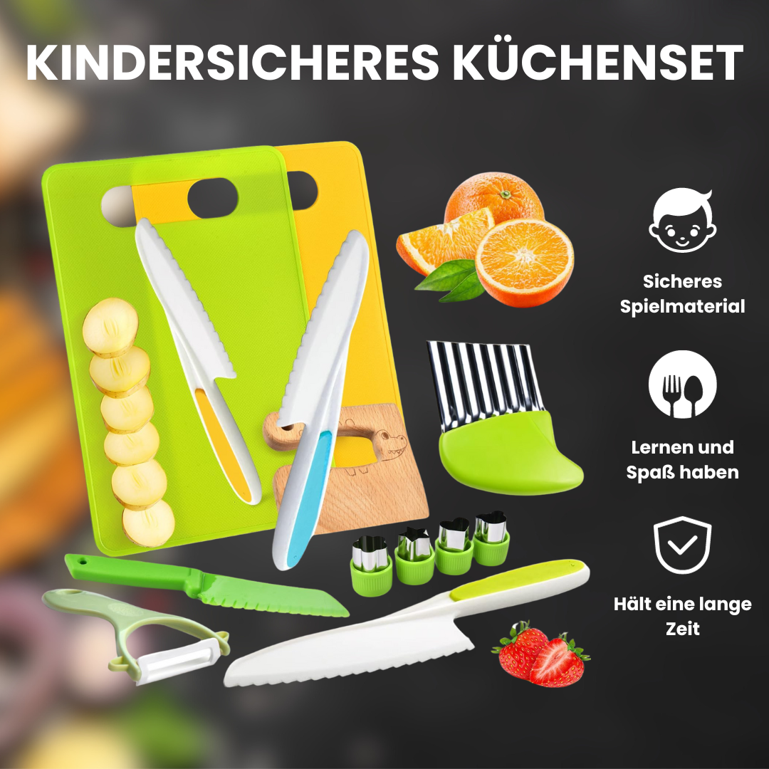 Exklusiv für Kinder hergestellte Küchengeräte, die 100%ige Sicherheit gewährleisten und gleichzeitig praktische Kocherfahrungen ermöglichen, die die Selbstständigkeit kultivieren und die Annahme gesünderer Ernährungsgewohnheiten fördern.