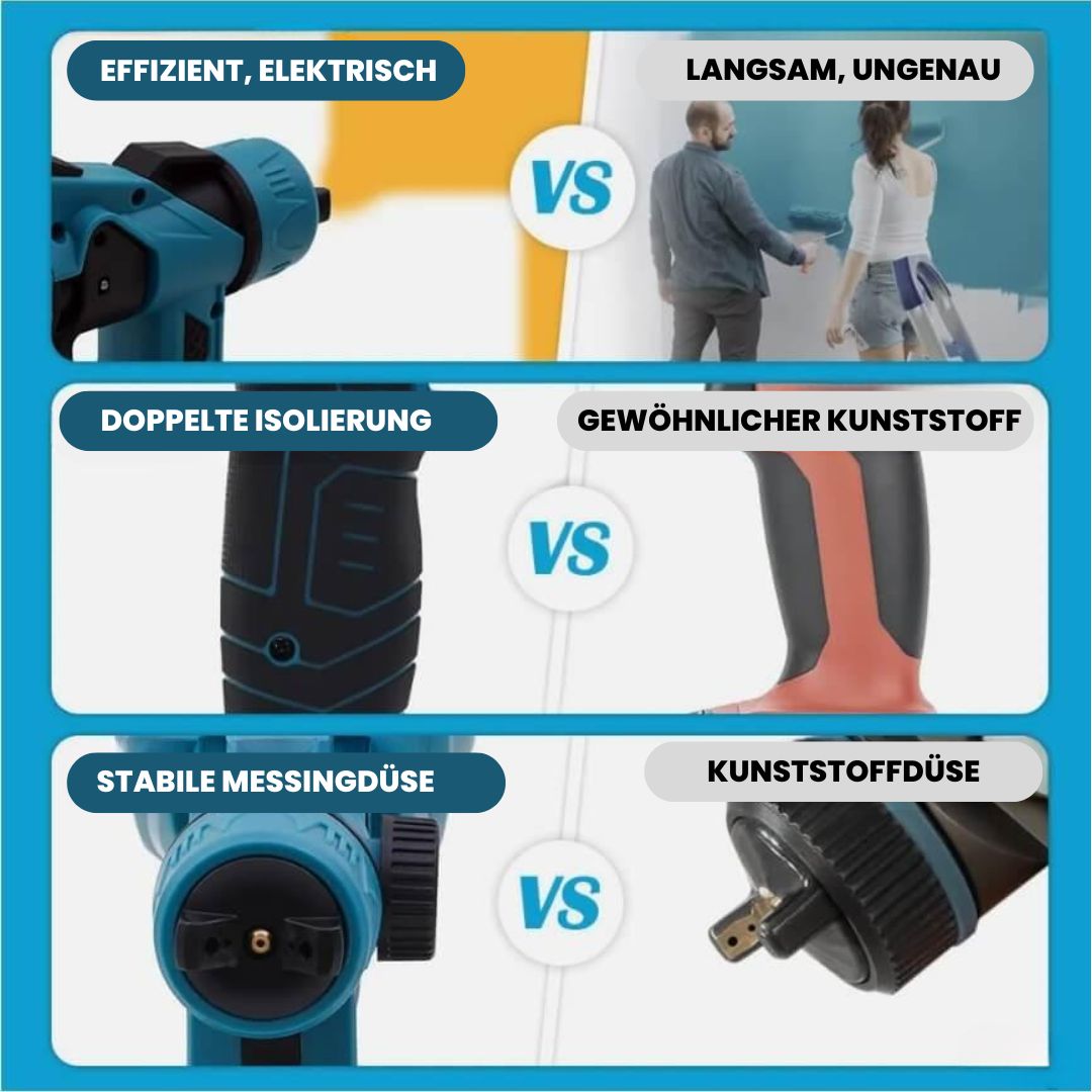 Vergessen Sie unsaubere Anstriche und ungleichmäßige Oberflächen! Mit unserer Hochdruck-Farbspritzpistole erzielen Sie professionelle Ergebnisse in jeder Situation. Die fortschrittliche Sprühtechnologie sorgt für eine präzise, gleichmäßige Verteilung der Farbe, ohne Tropfen, Flecken oder Pinselstriche.