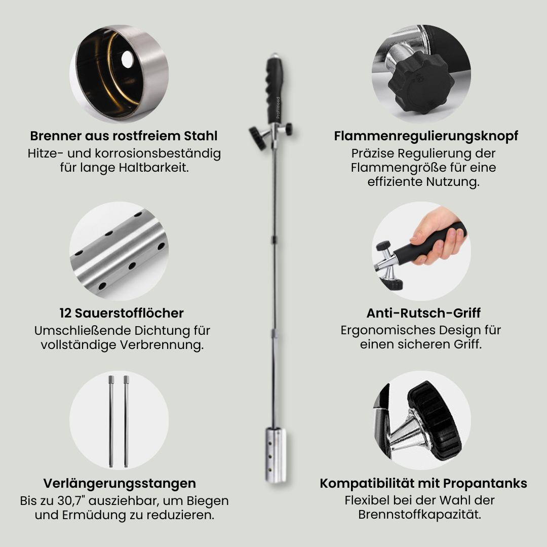Der 30-Zoll-Verlängerungsstab hält Sie sicher von der Flamme fern. Mit Anschlüssen aus reinem Kupfer und Tankanschlüssen mit doppelter Dichtung gewährleistet ProfiWeed, dass kein Gas ausläuft. Alle Stahlteile sind wärmebehandelt, um Haltbarkeit, Hochtemperaturbeständigkeit und Korrosionsschutz zu gewährleisten. Jedes Gerät wird strengen Luftdichtheitsprüfungen unterzogen, um die höchsten Sicherheitsstandards zu erfüllen.