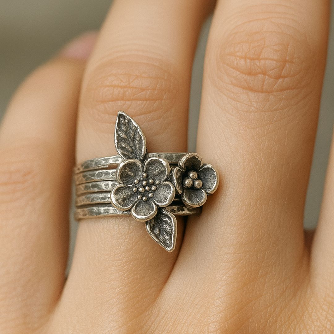 Das detailreiche Muster aus zarten Silberblüten schafft ein harmonisches Zusammenspiel von Naturinspiration und edler Raffinesse. Jede Schicht legt sich sanft übereinander und erzeugt so eine besondere Tiefe – ein Ring, der feminine Leichtigkeit mit einem Hauch von Vintage-Romantik verbindet.